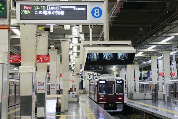 3路線ともに優等列車の終電は23:45。この列車の発車時刻が近づくと、この時間にしか聴くことができない放送が流れます。普段聞きなれないイントロから始まるその曲は「第三の男」。阪急大阪梅田駅では各線の終電の発車前にはこの曲が流れます。この曲が流れたら終電の発車時刻が近づいている合図。飲み会帰りのサラリーマンも話し込んでいる女性客もそれぞれ家路につきはじめます。