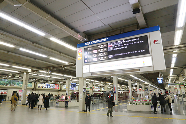 大きな電光掲示板は頭端式ホームが美しい阪急大阪梅田駅。