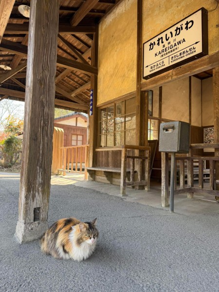 ●列車の来ない嘉例川駅へ行くと毛の長い知らない猫がお出迎えしてくれました。