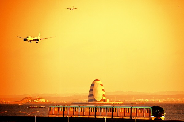 ●夕陽が羽田沖を染める頃、高架を快走する2000形モノレールの上空には北風により着陸の旅客機が次々とやってきた。