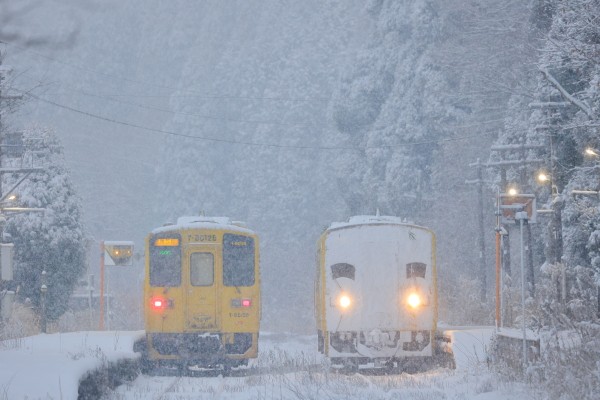 ●九州も雪景色。しんしんと降り注ぐ高原の駅に厚化粧の気動車が現れました。