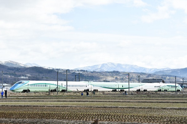 車内で足湯が楽しめた「とれいゆ」。新幹線の歴史上珍しいジョイフルトレインであった。 ‘22.3.27 奥羽本線 蔵王~山形 P:山中英一 (鉄道投稿情報局より)