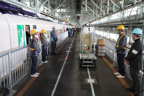 cfcb45ff405e3a37e7fe7e55eb1fb8cb 中央やや右寄りに見える台車型の車両がAGVで、カゴ台車をそれぞれ決められた号車の扉付近まで無人で移動させる。地面に引かれた白線が、自動運転の際の目印だ。 【この画像の記事に戻る】 デビューから30年以上 荷物輸送新幹線「はこビュン」に生まれ変わりなお活躍を続けるE3系の足跡 前の画像