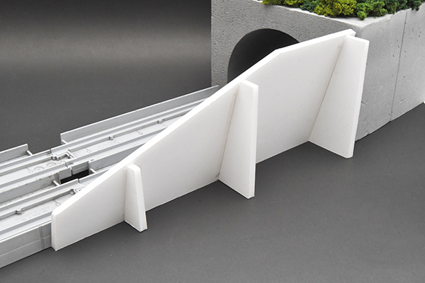 DSC_9512 擁壁の反対側は脚を取付。この脚もパソコンで作図したものをコピー用紙に印刷して切り出している。 【この画像の記事に戻る】 プラレールリアルクラスの100系に似合う舞台を! 即席新幹線トンネルジオラマを作ろう 前の画像 次の画像