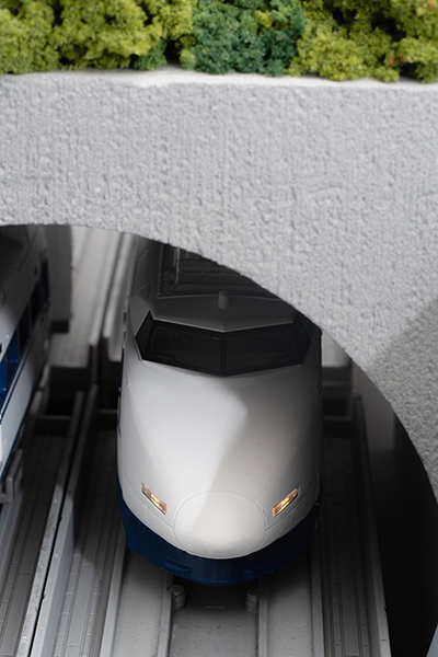 DSC_9541 縦アングルでトンネルから出てくるところを撮る。トンネル内だと点灯するヘッドライトもよく目立つ。 【この画像の記事に戻る】 プラレールリアルクラスの100系に似合う舞台を! 即席新幹線トンネルジオラマを作ろう 前の画像