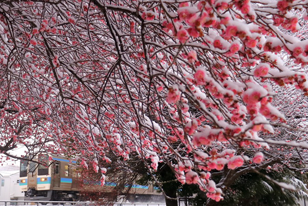 ●雪帽子の紅梅が、211系を見送ります。この区間の211系は、残り時間僅か。