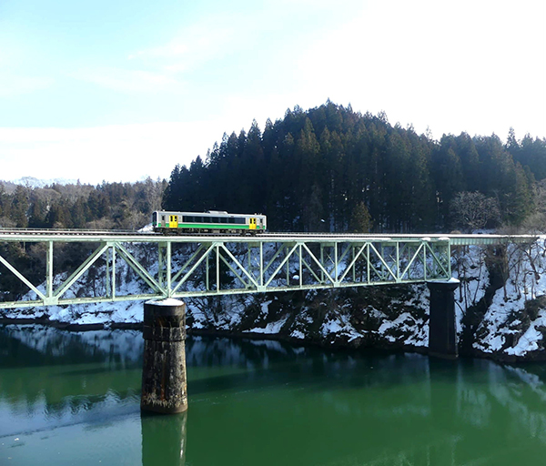 ●朝日を浴びて結氷した錦秋湖にかかる橋をキハ100が渡ります。
