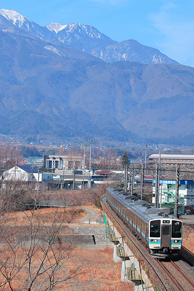 ●冬晴れの下、雪化粧の鳳凰三山を背に211系が塩川橋梁を渡る。