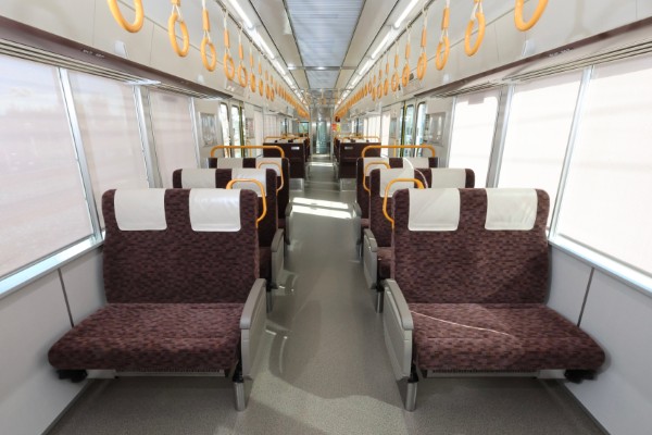 車内は「Urara」と同様で、扉間に4列の転換クロスシート、車端部にロングシートを配置。よりスムーズに乗降できるよう、出入り口付近のスペースが大きくなっています。シートのモケット色はえんじ色で、これも「Urara」と同じ色のようです。ドア上部の情報表示装置では2ヶ国語での行先案内が表示されます。