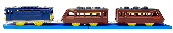 サイドビュー。シックなブラウンの車体とプラレールらしい黄色い車輪が上手くバランスを取っている。