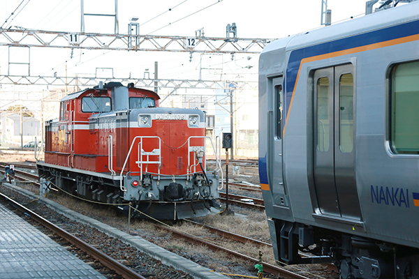14 9時過ぎに和歌山港線の列車を見送ると同時にDD51を切り離し、帰路につくために入換を開始する。 ‘26.2.4 南海電鉄 南海本線 和歌山市 【この画像の記事に戻る】 私鉄の路線にDD51見参!?珍しい並びも展開!南海8300系の甲種輸送を追跡してみた! 前の画像 次の画像
