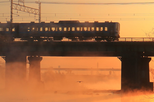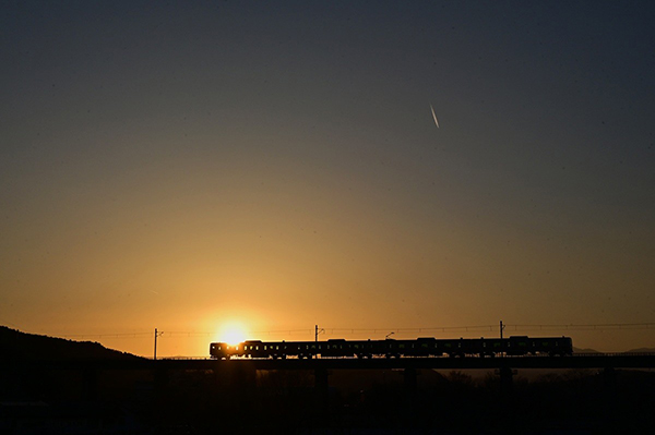 冬至から二か月、日没の位置が北に移って、電車に夕日がかかるようになりました。春の夕景色です。