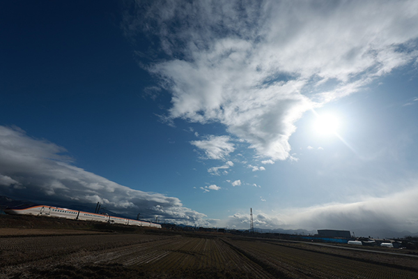 雲の切れ間から太陽が顔を出し、山形新幹線「つばさ」の側面がギラリと光り、青空と雲、「つばさ」がうまく撮れました。