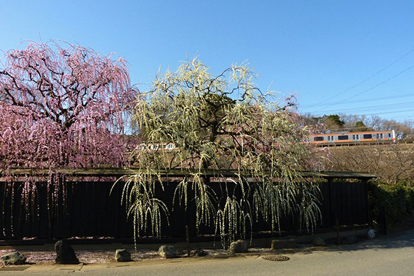 民家の庭に咲いた紅白のしだれの後ろを、オレンジラインの電車が通り過ぎます。