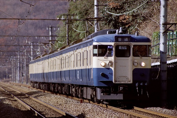 豊田車両センター115系6両編成の5号車モハ114に、始発列車の霜取り用としてパンタグラフが増設された頃。この後モハ114の通常使用のパンタグラフはシングルアームタイプに交換された。始発列車が201系に置き換わると、201系H編成8号車モハ201にWパンタとなった車両が登場した。 '94.10.25 中央本線 相模湖~高尾