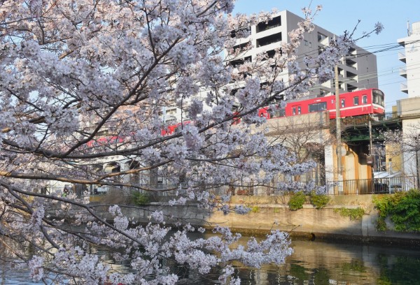 ●横浜市内の定番の桜スポットでもある大岡川沿いに咲く桜も満開を迎え、赤い電車に華を添えました。