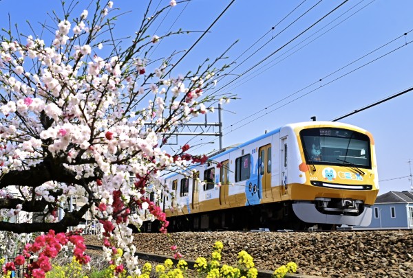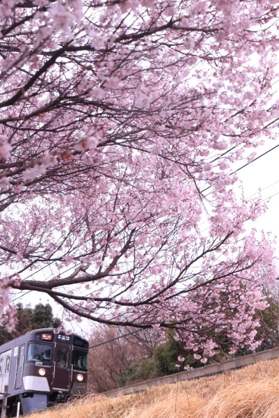 ●見頃のさくらの向こうに、チョコ電の急行多摩湖行き。