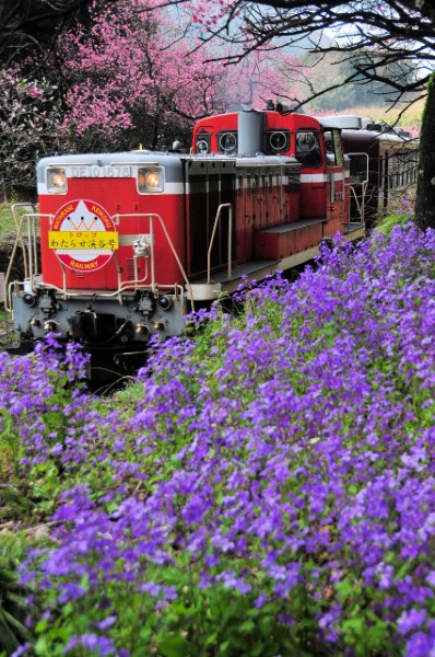 ●ムラサキナノハナに迎えられる「トロッコわたらせ渓谷号」。