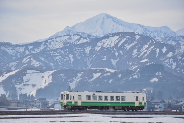 ●残雪の山々をバックに単行列車がのんびりとやって来ましたが、まだまだ雪景色の魚沼の地にも遅い春は確実にやって来ます。