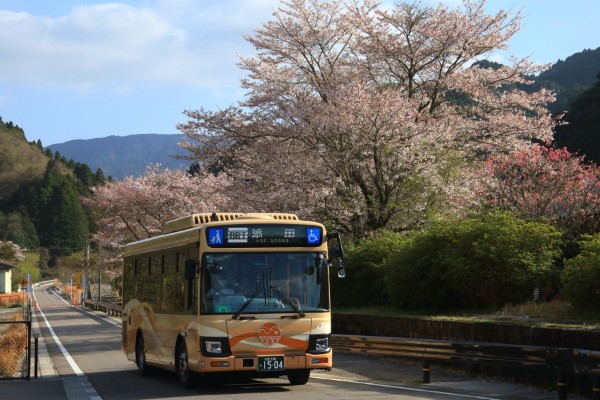 ●桜咲く彦山駅、かつてあったのホームの横を、今はBRTひこぼしラインのバスが駆け抜けます。