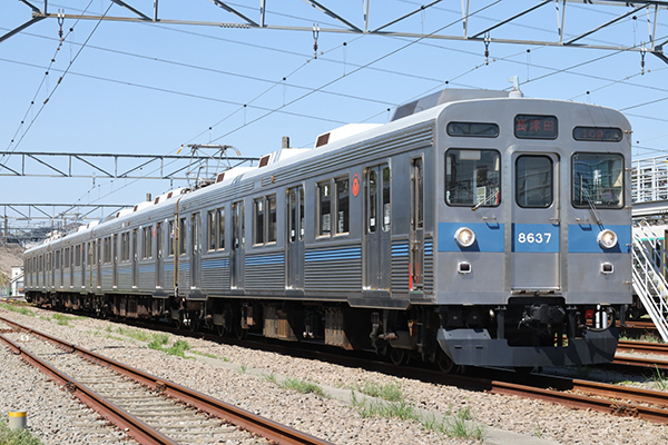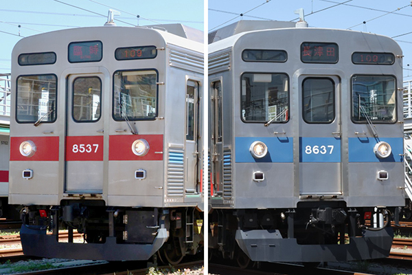 今回動態保存されることとなった4両は(←渋谷)デハ8637+デハ8797+サハ8980+デハ8537(中央林間→)の4両。このうちデハ8637と片側の側面は青帯、デハ8537とその反対側は帯なしの姿となり、1編成で2種類のデザインパターンを見ることができます。