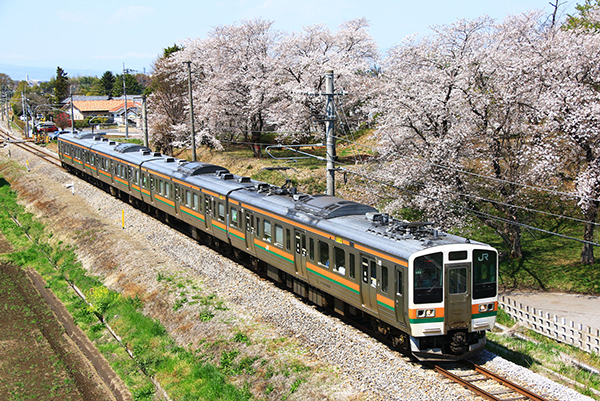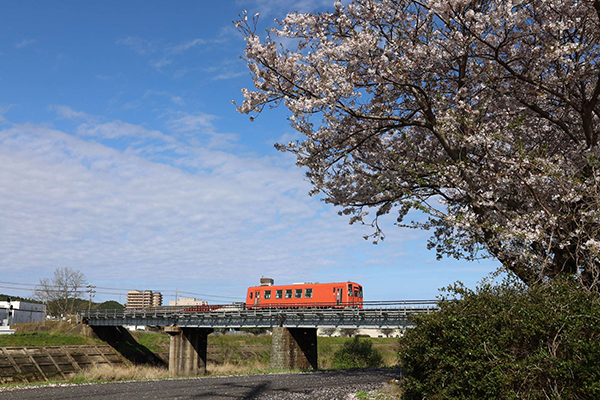 ●春の空気に包まれた線路脇。E131系が満開の桜の前を通り過ぎて行きました。