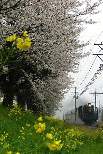 ●雨の桜並木に「SLパレオエクスプレス」がやって来ました。まもなく終着です。