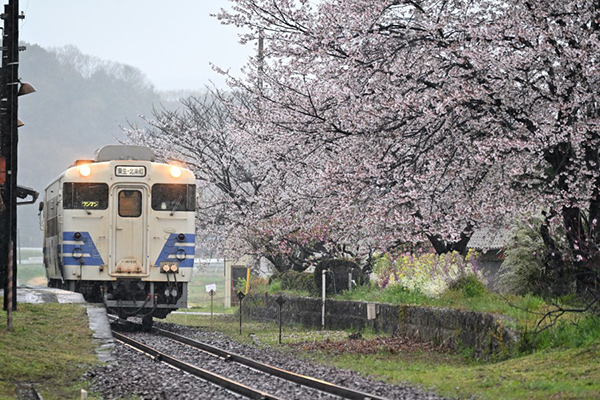 ●冷たい雨が桜を打つ中、ディーゼルカーが静かに発車して行きました。