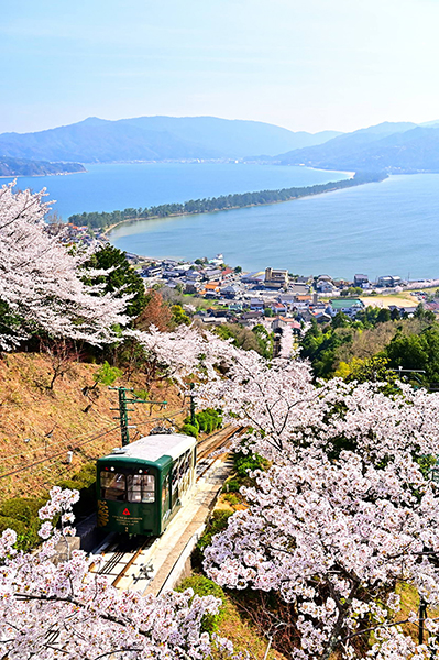 ●満開の桜に迎えられる天橋立ケーブルカー。まさに春爛漫。