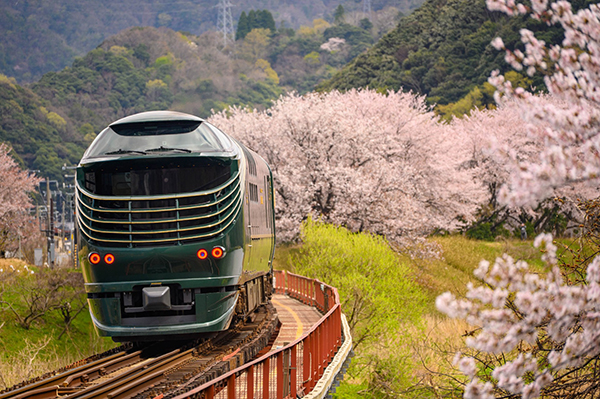 ●何とか残ってくれた矢田川沿いの桜。「瑞風」が花を揺らして鉄橋を渡る。いよいよ山陰の旅も大詰め。