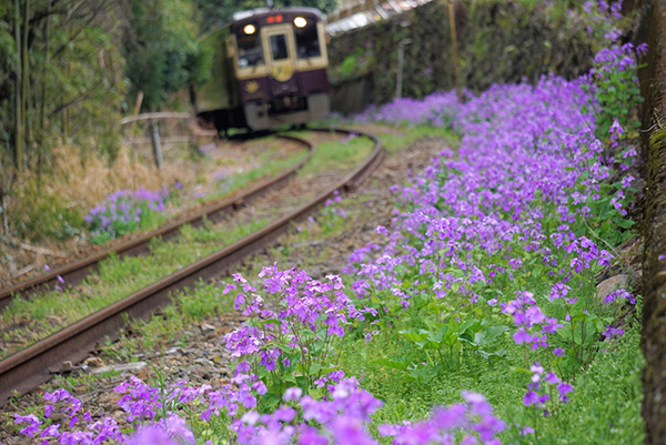 ●桜に菜の花、青い空。春爛漫の中、気動車が花を添えます。