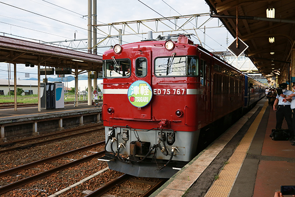 10 大館に停車中の急行「津軽」。主要駅での長時間停車では参加した乗客たちが各々楽しんでいた。 【この画像の記事に戻る】 昔のダイヤに近い運行で国鉄時代の「客レ」を追体験!ED75牽引のリバイバル急行「津軽」を振り返る 前の画像 次の画像
