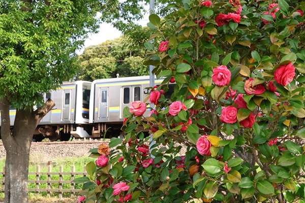 ●見頃を迎えた椿の向こうを、209系が静かに通過して行きました。