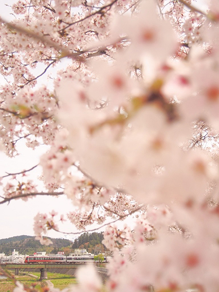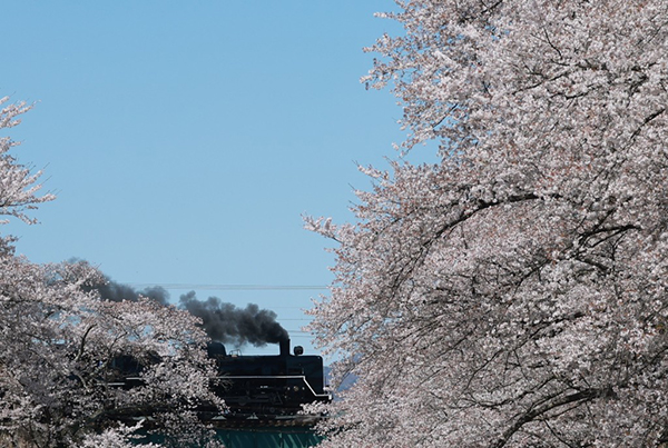 ●藤田川の両側に咲き誇る満開の桜、その奥に鉄橋を渡るSL、澄みきった青空。