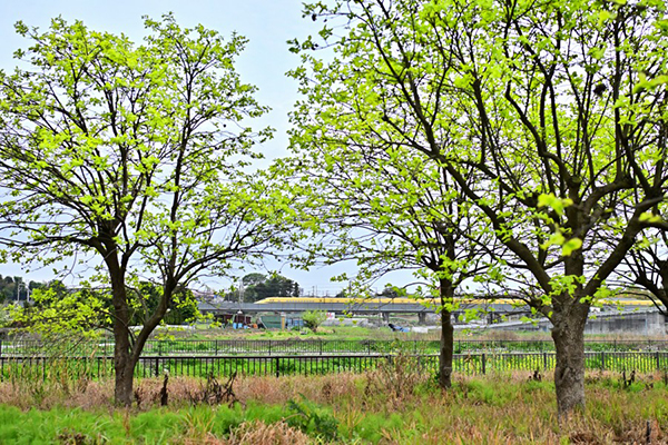 ●すっかり葉桜になったソメイヨシノの上空を湘南モノレールが飛んで行きます。