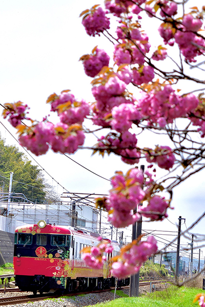 八重桜と「花嫁のれん」が織りなす、春を彩る花の共演。