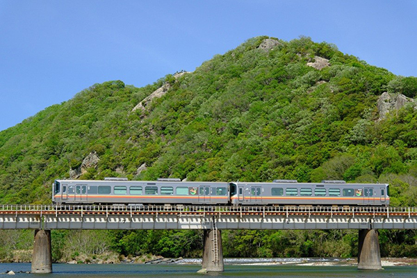 ●姫新線沿線にも新緑の季節到来。新緑が映える山々をバックに、足取りも軽くローカル列車が駆け抜ける。
