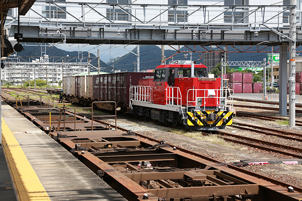 4 手順4「HD300が着便の貨車を迎えに行く」の入換。本務機が離れた貨車にHD300が連結される。 【この画像の記事に戻る】 入換機のHD300が本線を跨ぐダイナミックな作業を見学!山陽本線大竹駅の貨物駅を見てみよう! 前の画像 次の画像