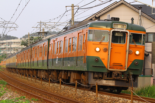 日本海側を行く湘南色と横須賀色の113系。これにより湘南色の113系がJR東日本から消滅した。