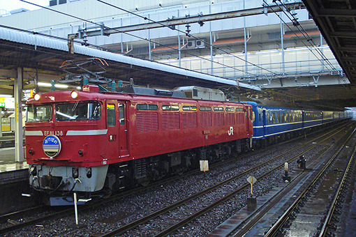 1979年4月東新潟機関区に新製配備、その後青森運転区に転属となり、1987年4月国鉄分割民営化によりJR東日本青森車両センター所属となる。長年にわたり寝台特急牽引などで活躍した。2015年11月下旬郡山総合車両センターに回送、2015年12月上旬保存のため個人宛てに陸送された。写真は「あけぼの」を青森〜上野をロングランで牽引していたEF81 138、この後2009年3月以降→廃止まで長岡〜上野はEF64牽引となったため上野口でその姿を見ることはなくなった。 ’08.4.8 東北本線 大宮 P:楢井勝行