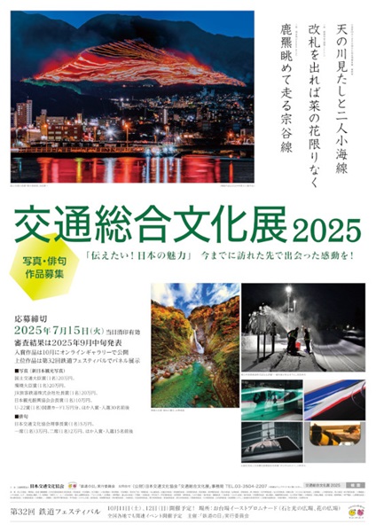 公益財団法人 日本交通文化協会は、「鉄道の日」実行委員会とともに、駅を舞台に、日本の芸術や文化、観光の振興を目的とした「交通総合文化展2025」を開催する。この開催にあたり、「『伝えたい! 日本の魅力』写真・俳句作品」を募集する。入賞作品は10月中旬にオンラインギャラリーにて公開されるほか、東京都内での発表展示が予定されている。詳細は以下の通り。