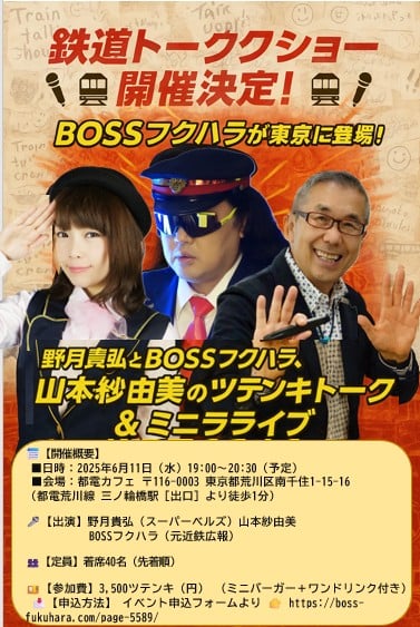 東京・三ノ輪の都電カフェでは、2025年6月11日に元近鉄の名物広報マンだったBOSSフクハラさん、スーパーベルズの野月貴弘さん、山本紗由美さんによる鉄道トークショーを開催します。