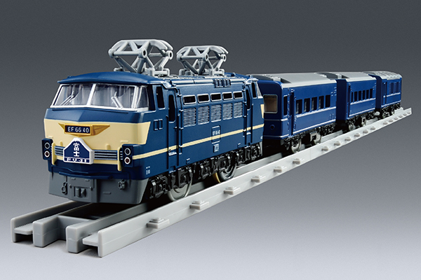 また、「プラレールリアルクラス」シリーズにも新商品が登場。今回は「寝台特急富士」が製品化される。「ブルートレインあさかぜ」に続く東京口ブルートレインの製品化となり、今回は「富士」のヘッドマークのほか「はやぶさ」のヘッドマークパーツ・ステッカーも付属する予定。また、牽引機のΕF66は国鉄仕様の40号機となる。