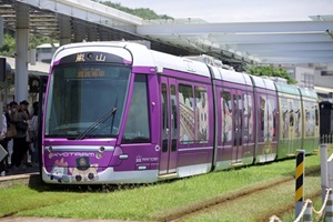 高雄メトロのラッピング電車。編成の半分ずつ、嵐電と江ノ電のラッピングを施している。