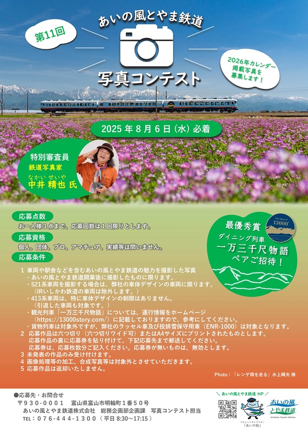 あいの風とやま鉄道では、同社の車両や駅舎、沿線風景などをテーマとした「第11回 あいの風とやま鉄道写真コンテスト」を開催する。応募作品は富山駅等に展示及びカレンダーに掲載される予定で、最優秀作賞には観光列車「一万三千尺物語」のペア招待券が用意されている。詳細は以下の通り。