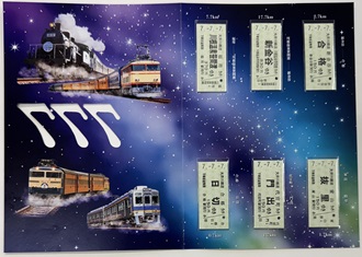 専用の記念台紙と、「-7. -7. -7.」の刻印が入ったB型硬券6枚のセット。表紙の「777」は切り抜きとなっており、天の川をイメージした台紙が覗いて見える仕様。乗車券の区間も駅間キロに「7」の入る組み合わせとなっている、こだわりの一品だ。