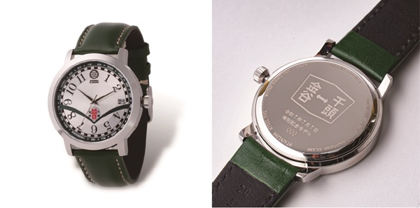 腕時計のイメージ画像。文字盤裏面には行先板とシリアルナンバーが刻印されている。