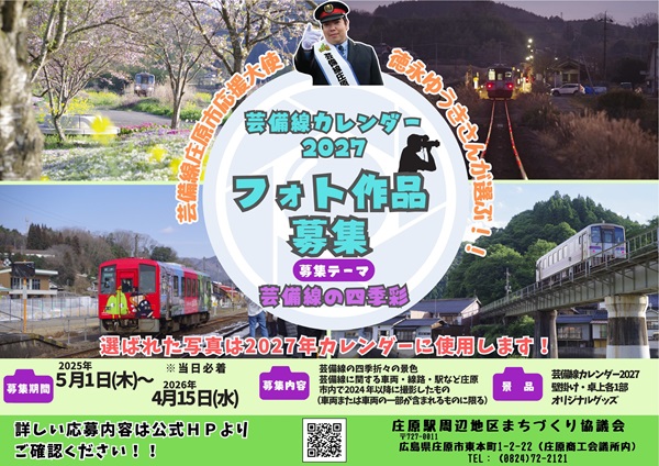 庄原駅周辺地区まちづくり協議会は、「芸備線カレンダー2027」を作成するにあたり、カレンダーに掲載する写真を募集している。写真は、芸備線庄原市応援大使の徳永ゆうきさんにより選考され、選ばれた写真は同カレンダーに使用される。