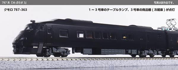 KATOより、2025年7月発表の試作品画像が到着した。今回はまず787系「36ぷらす3」が登場。光沢感ある黒色塗装がされた状態となっており、実車の重厚感が再現されている。また、1両ごとに異なる内装も再現される。