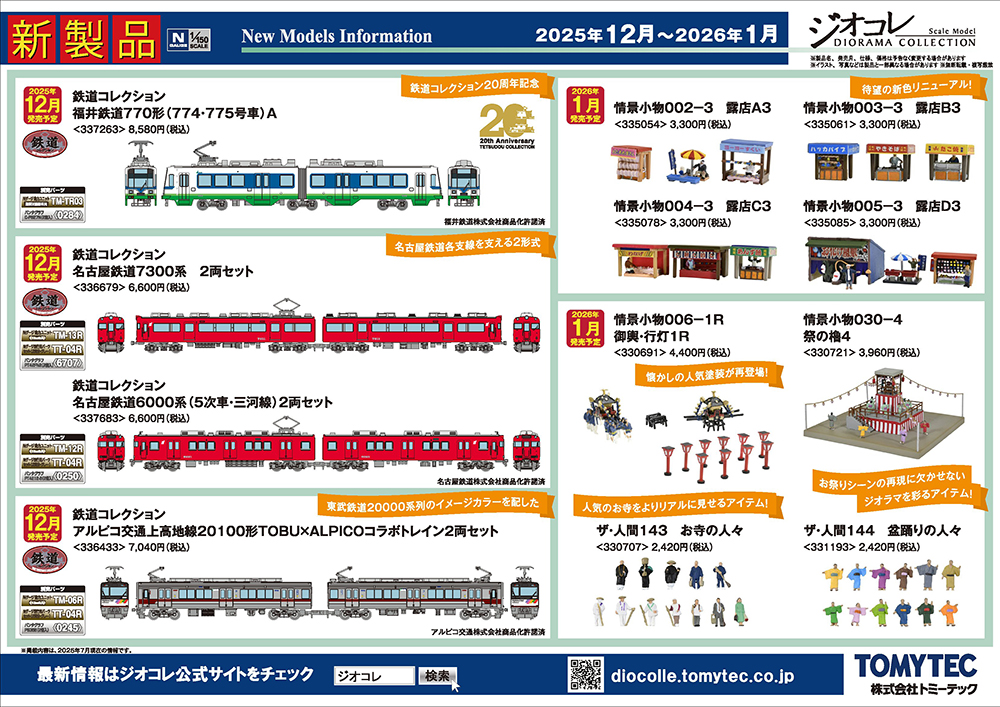 鉄道コレクションシリーズからは同シリーズ20周年を記念して、同じくデビュー20周年の福井鉄道770形(774・775号車)Aが登場。また、名古屋鉄道7300系2両セット、同じく名古屋鉄道6000系(5次車・三河線)2両セットに加え、アルピコ交通上高地線20100形TOBU×ALPICOコラボトレイン2両セットが登場予定となった。